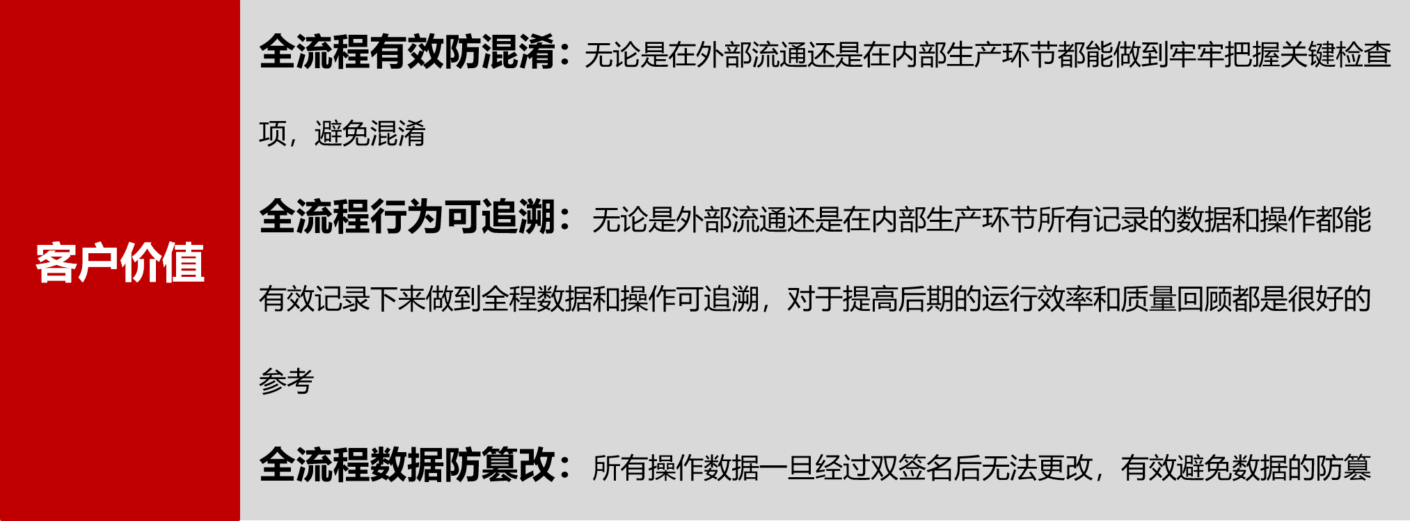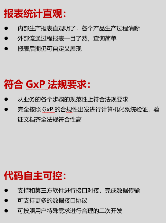 智覓医药个性化治疗信息平台解决方案,帮助企业理清新兴医药行业的追溯流程,解决新兴医药行业的内部生产的追溯痛点,打通流通环节的对接难点,扫清多方工作交叉的流程盲点。 真正做到了全流程的闭环操作,达到内部生产防混淆,外部流通可追溯,多方交叉放出错的目的。 同时整个产品完全按照GxP合规要求对解决方案进行计算机化系统验证,保证从合规性的角度完全符合法规要求。让企业真正做到全程防混淆,全程可追溯的目的。