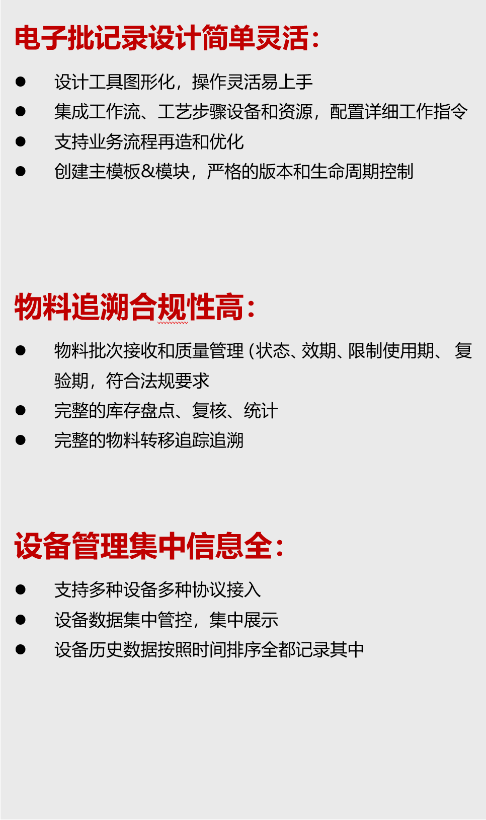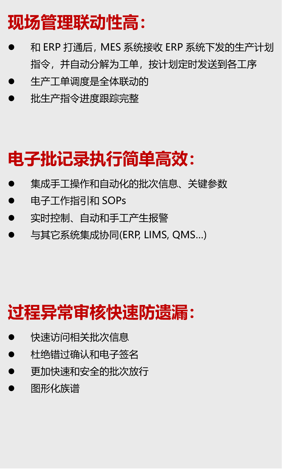 西门子医药行业解决方案是行业内市场占有率最高,方案最成熟也是国内落地案例最多的MES解决方案,整体方案从化学制药到生物制药再到细胞疗法等等都具有成熟的解决方案和实施落地的经验。 西门子MES解决方案从物料管理、生产路径管控、仪器接入和全程追溯方面都具有标准化,体系化和简单配置的特点,真正做到了通过MES平台实现一体化的GMP生产质量管理。